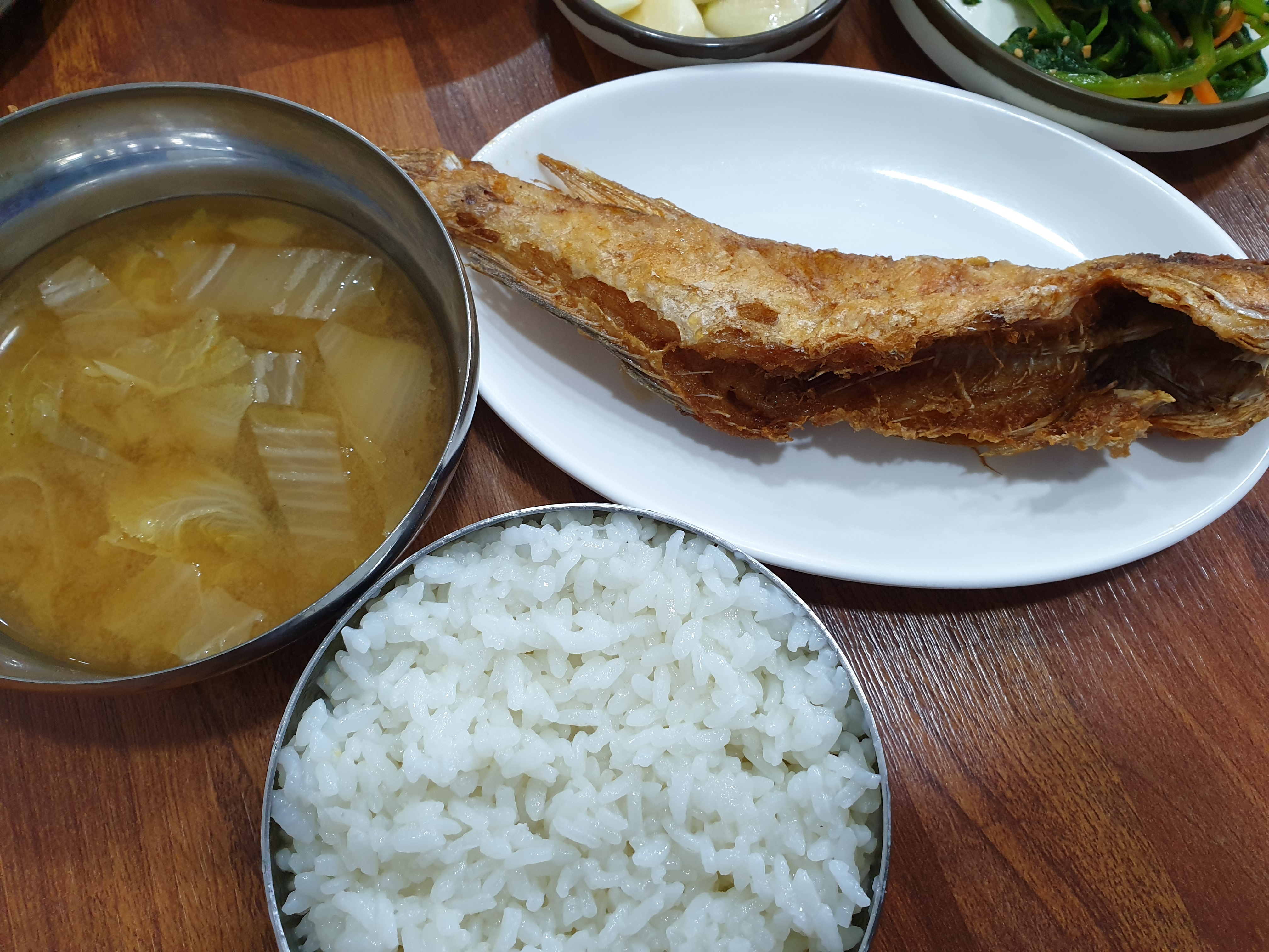 바싹하게 튀겨진 옥돔구이와 계란찜, 잡채만으로도