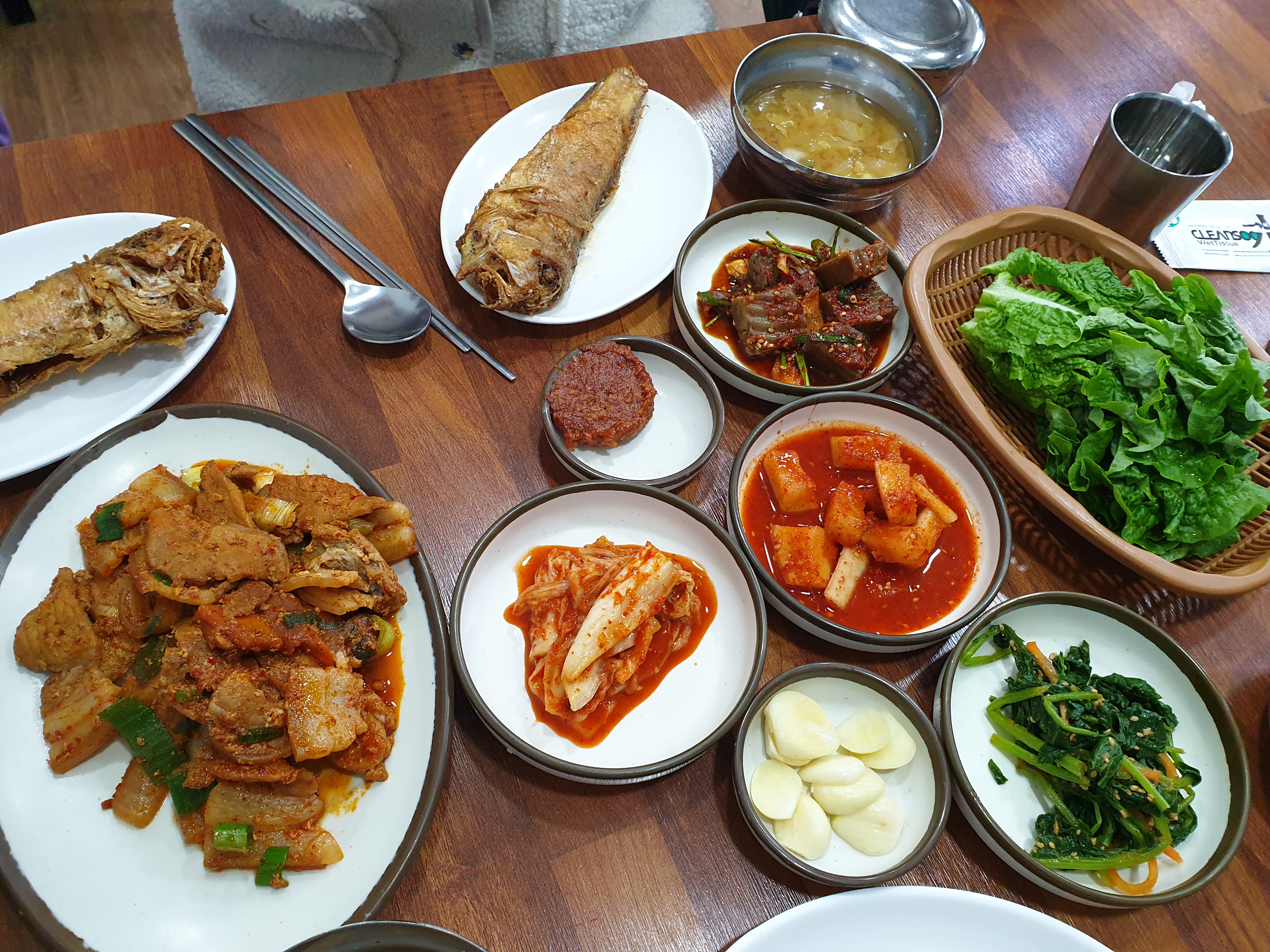 기본 찬으로 제육볶음과 쌈, 김치류, 나물류, 잡채,